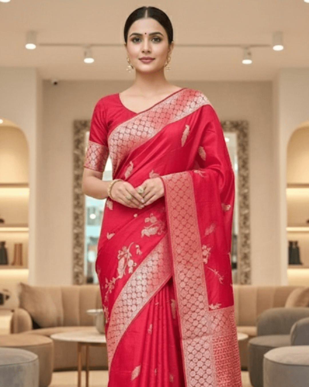 Red Katan Saree Peacock motif