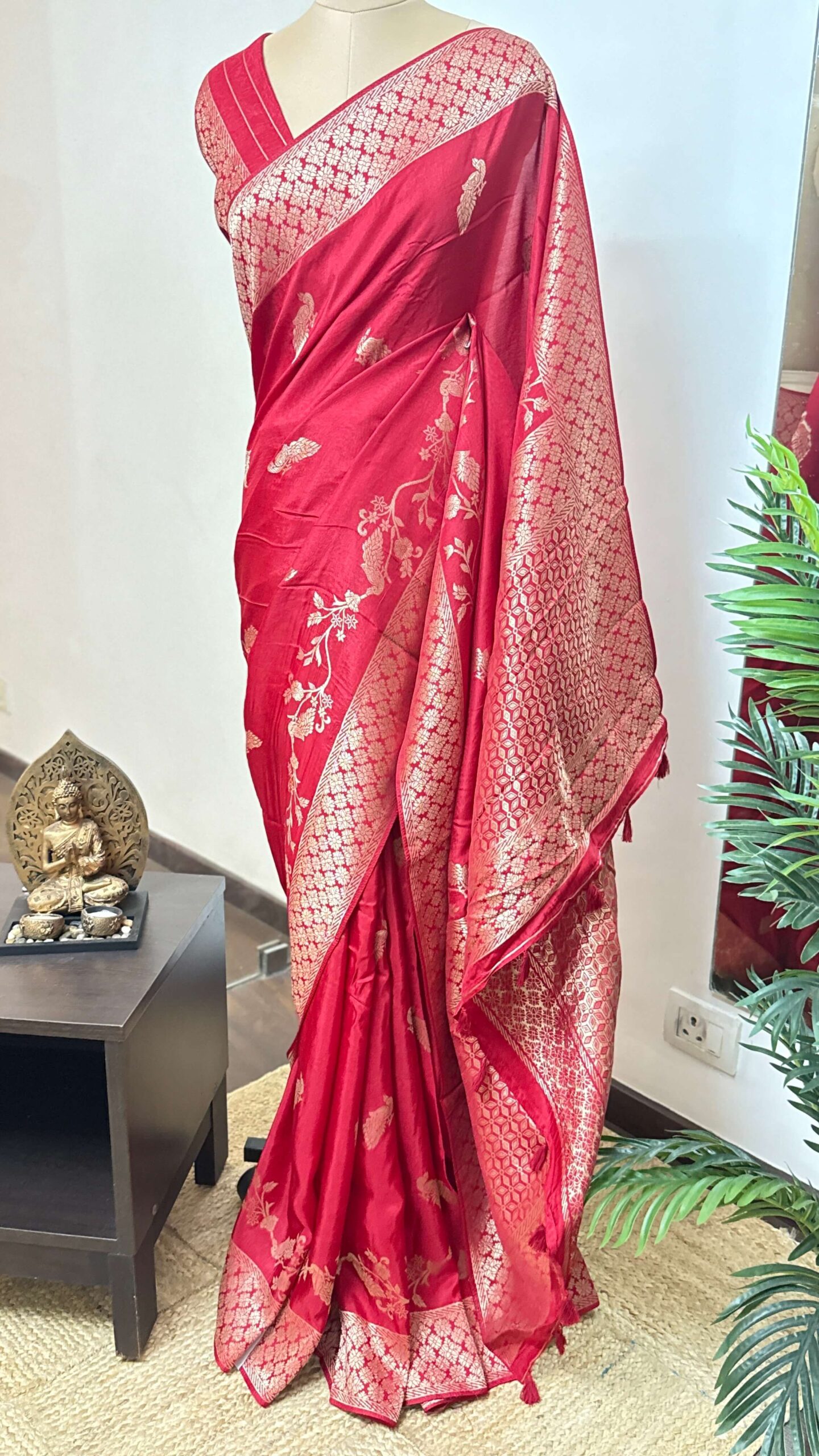 Be the first to review “Red Katan Saree Peacock motif”